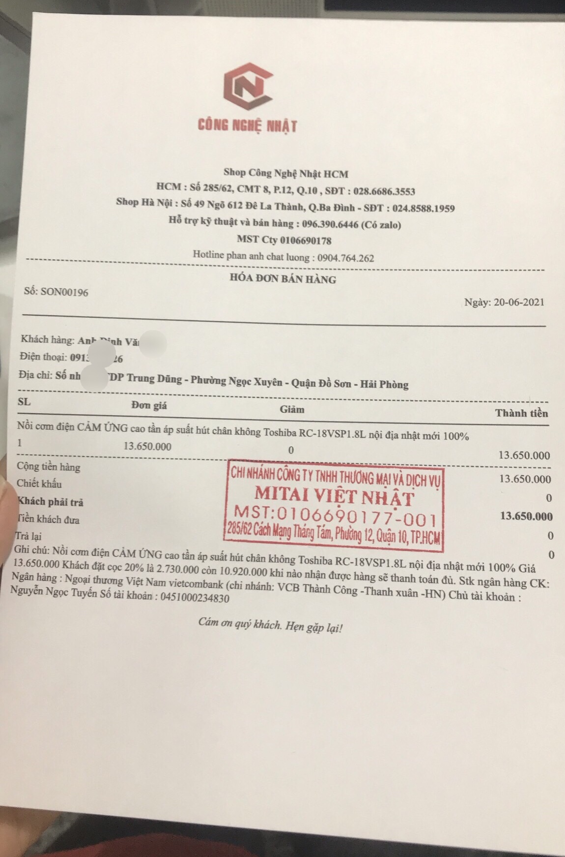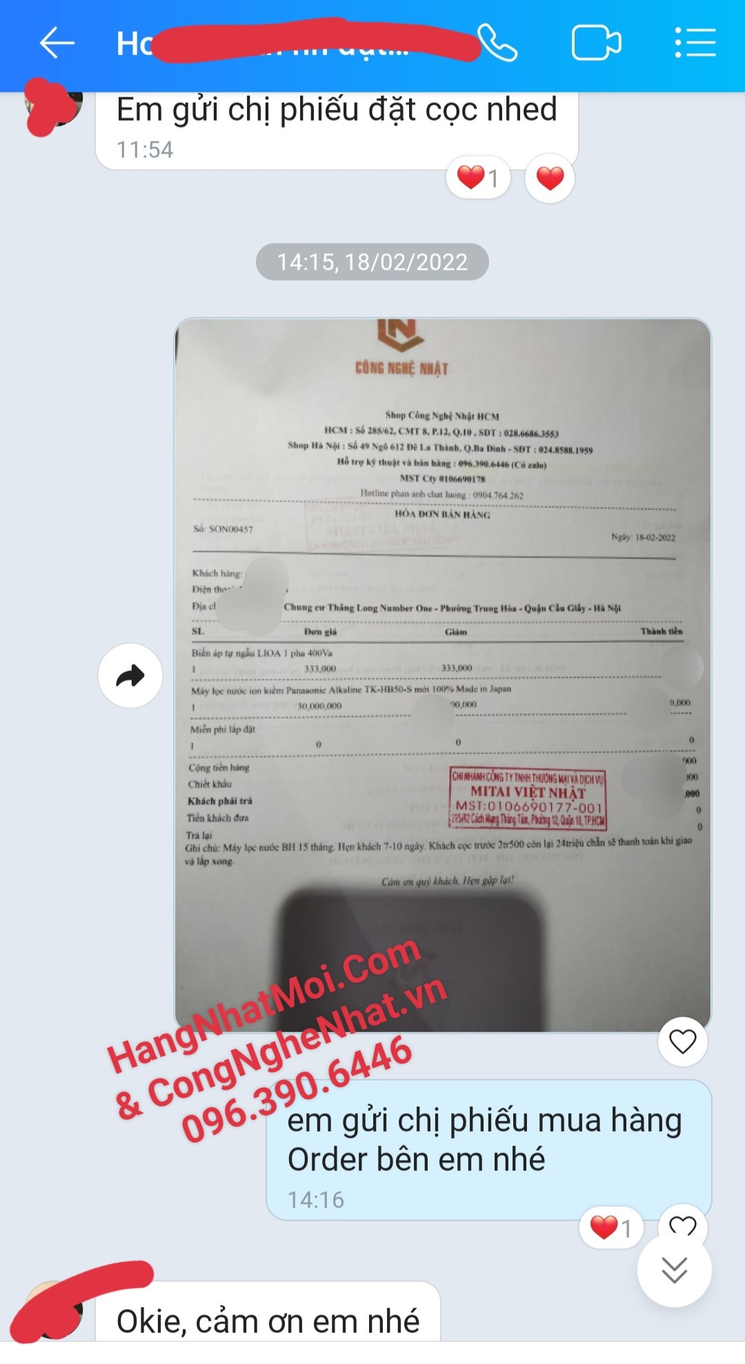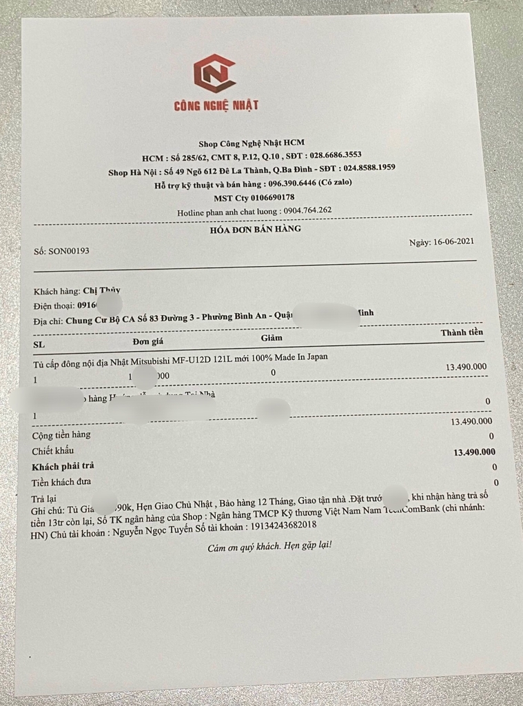 Sau khi đặt hàng shop sẽ gửi mẫu hóa đơn như vậy cho quý khách :