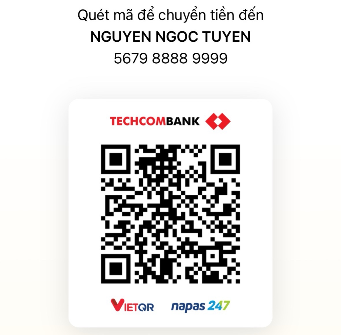 Chủ tài khoản : Nguyễn Ngọc Tuyến, Số tài khoản : 5679.8888.9999