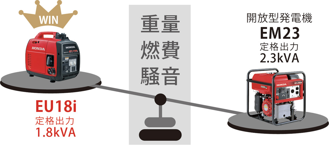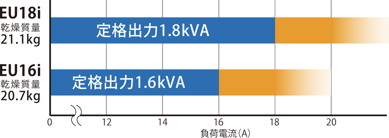 EU18i nhận ra việc lắp động cơ 120 phân khối mà không làm tăng kích thước. So với một máy phát điện loại 1600VA thông thường được trang bị động cơ 80cc, nó có dung tích lớn hơn khoảng 1,5 lần và tạo ra công suất dồi dào.