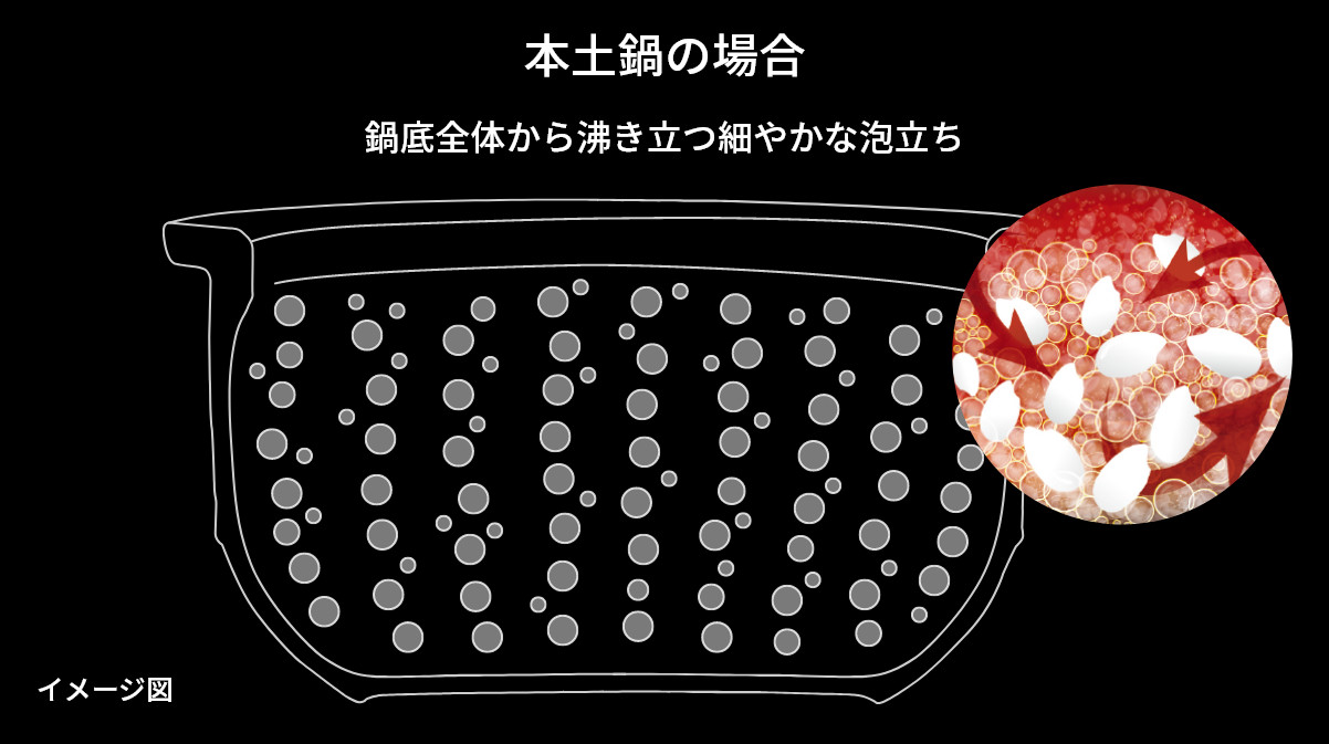 Đáy của chiếc xoong gốm có các vân sóng đặc biệt, công dụng của nó là để gia tăng thêm bọt khí tỏng quá trình sôi. Hỗ trợ thêm quá trình đảo đều hạt gạo trong quá trình nấu.
