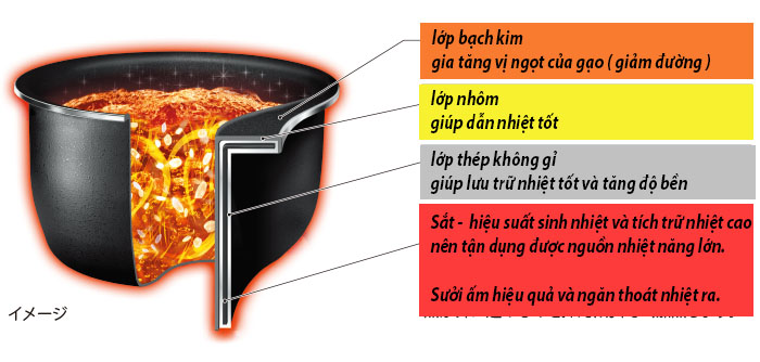 Ngoài ra, hiệu ứng của lớp mạ bạch kim trên bề mặt bên trong của nồi trong và nắp trong cũng mang lại vị ngọt cho cơm.