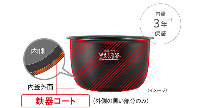 Lòng nồi được làm từ chất liệu sắt tương thích với IH, có hiệu suất sinh nhiệt và giữ nhiệt cao cùng với lớp nhôm ở giữa dẫn nhiệt cao