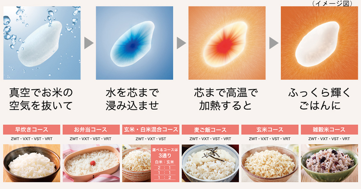 Công nghệ "hút chân không" độc quyền từ Toshiba,quá trình hút chân không giúp loại bỏ không khí khỏi gạo và hút nước vào lõi tạo ra vị thơm ngọt tinh túy của gạo.
