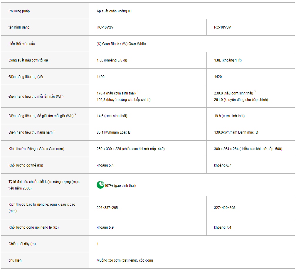 Một vài thông tin về Nồi cơm điện IH Áp suất Hút chân không Toshiba RC-10VSV Model 2023