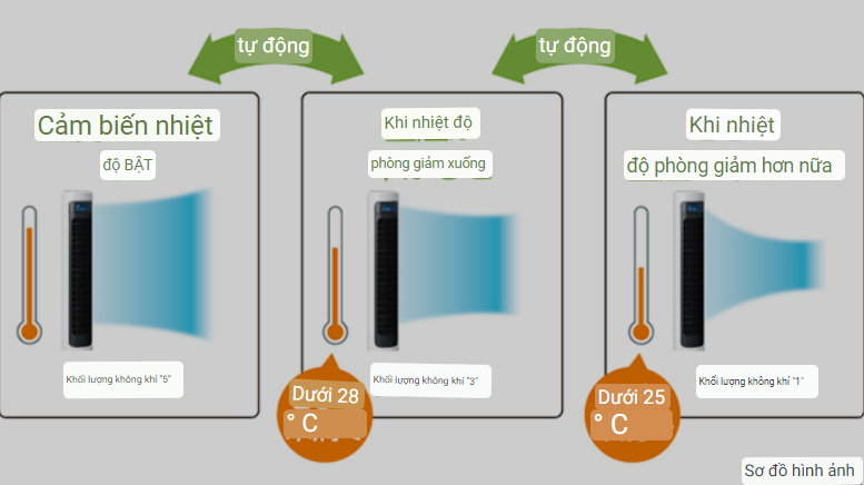 Lượng gió cài đặt ở mức "5" và đặt chế độ là "Tsuyome". Khi nhiệt độ phòng giảm xuống, quạt vận hành ở mức gió là dưới 28°C. Khi giảm nhiệt độ phòng lần nữa thì quạt sẽ hạ xuống ở mức nhiệt là 25°C.